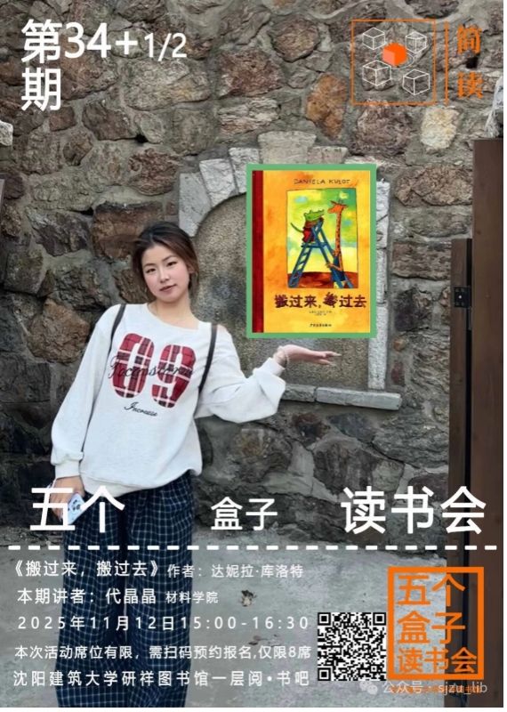 本期图书:《搬过来,搬过去》本期讲者:代晶晶 材料学院《搬过来,搬过去》是德国作家达妮拉·库洛特创作,作品延续跨物种情感主题,探讨亲密关系中差异调适的现实课题。时间:2025年11月12日 15:00-16:30地点:沈阳建筑大学研祥图书馆一层阅•书吧”