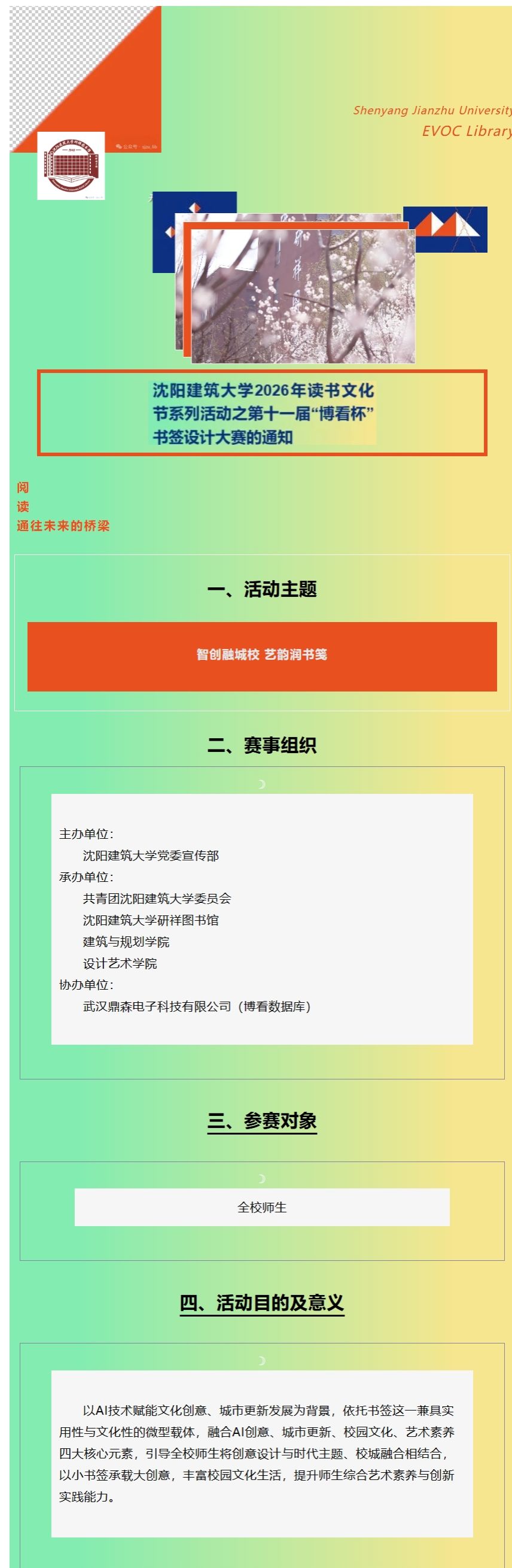 沈阳建筑大学2026年读书文化节系列活动之第十一届“博看杯”书签设计大赛的通知